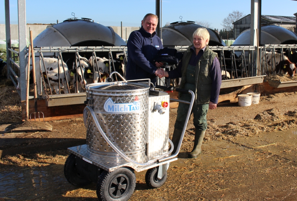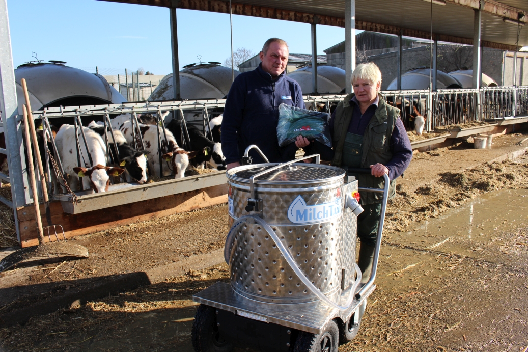 Zu diesem Anlass überreichte unser Verkaufsberater Herr Winkler der Herdenmanagerin Frau Weidemüller als Dankeschön eine besondere Zugabe. Eine Kälberjacke von Holm & Laue zum Schutz schwacher Kälber bei niedrigen Temperaturen und eine praktische BouMatic-Weste für die Kälberfrau, um gesund durch die kalte Jahreszeit zu kommen. Außerdem gab es eine Flasche Sekt, um das besondere Ereignis zu würdigen.